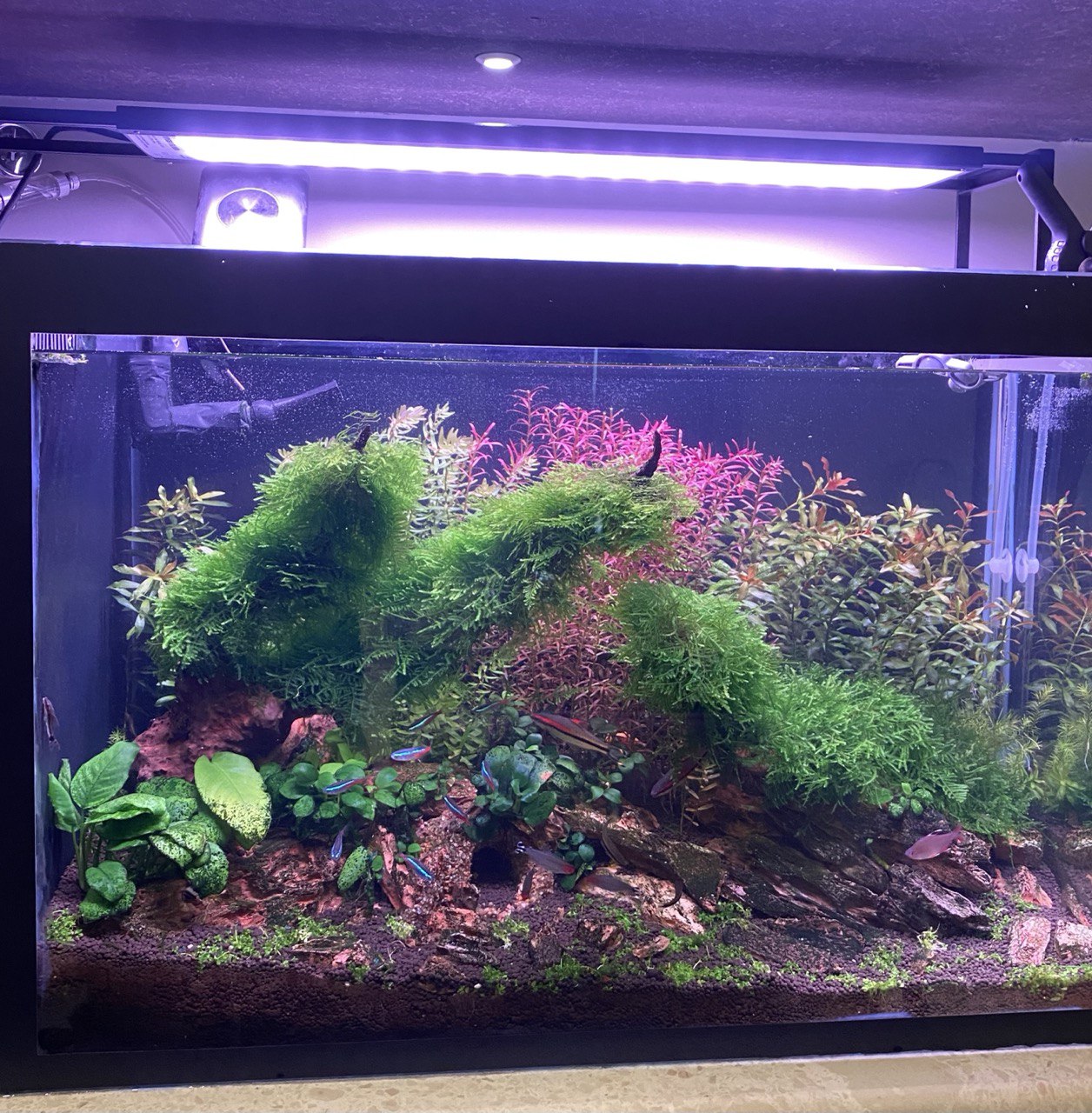 Immerse yourself in the natural allure of dragon stone and spider wood, meticulously arranged to form a captivating hardscape that serves as the foundation of this aquatic masterpiece. Adorned with an array of flora including Anubias plants, Java Moss, Monti Carlo, Ludwigia, Red Blood Rotala, and Green Rotala, each plant thrives within the nutrient-rich ADA soil substrate.